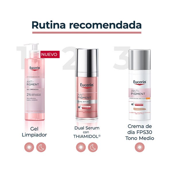 Se recomienda aplicar Eucerin Anti-Pigment Dual Serum por la mañana antes de utilizar Eucerin Anti-Pigment Día FPS 30.