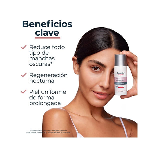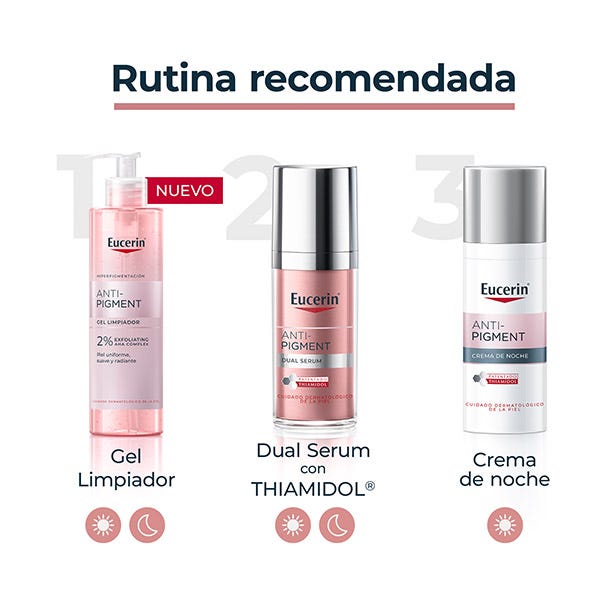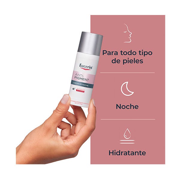 Para conseguir unos resultados óptimos, se puede utilizar junto con Eucerin Anti-Pigment Día FPS 30, Anti-Pigment Corrector de manchas y Eucerin Anti-Pigment Dual Serum.