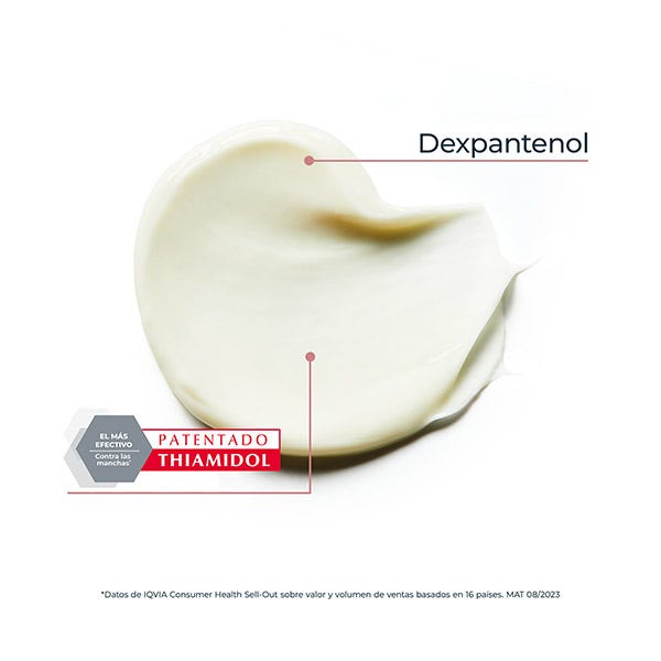 Este principio activo actúa en el origen de la hiperpigmentación inhibiendo la producción de melanina de la piel para que se atenúen las manchas oscuras existentes y para evitar la formación de manchas de hiperpigmentación nuevas. Por otro lado, el pantenol, que se convierte en ácido pantoténico en la piel, mejora la regeneración y la reparación cutáneas.