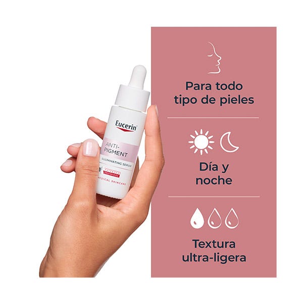La exposición a la luz del sol, los cambios hormonales y el envejecimiento pueden provocar hiperpigmentación. Para poner solución, Eucerin ha desarrollado Anti-Pigment Skin Perfecting Serum de Eucerin, un tratamiento antimanchas para el cuidado facial que aporta los siguientes beneficios: