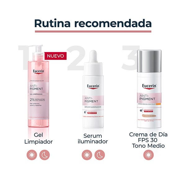 Para conseguir los mejores resultados, utilizar junto con Eucerin Anti-Pigment Día FPS 30 y Eucerin Anti-Pigment Noche.