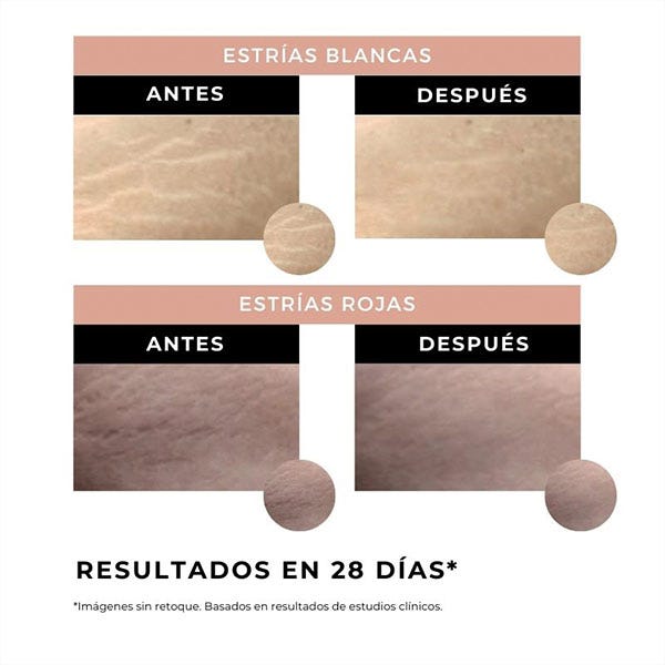 Recupera las estrías rojas hasta en un 83% y reduce la apariencia de las estrías blancas hasta en un 75%.