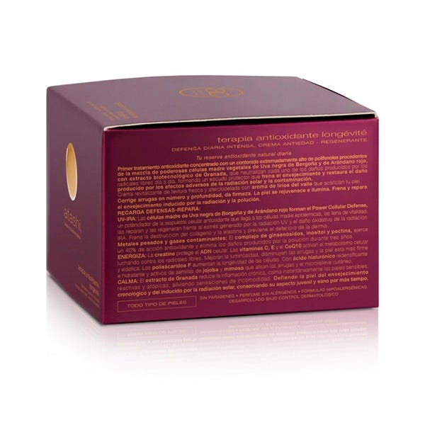UV-IRA: Las células madre de Uva negra de Borgoña y de Arándano rojo forman el Power Cellular Defense, un potenciador de la respuesta celular antioxidante que llega a las células madre epidérmicas, las llena de vitalidad, las reparan y las regeneran frente al estrés generado por la radiación UV y el daño oxidativo de la radiación IRA. Frena la destrucción del colágeno y la elastina y previene el deterioro de la dermis. Metales pesados y gases contaminantes: El complejo de ginsenósidos, inositol y pectina, ejerce un 40% de acción antioxidante y elimina los daños producidos por la polución durante tres años.