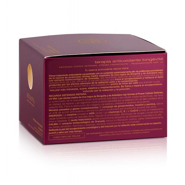 UV-IRA: Las células madre de Uva negra de Borgoña y de Arándano rojo forman el Power Cellular Defense, un potenciador de la respuesta celular antioxidante que llega a las células madre epidérmicas, las llena de vitalidad, las reparan y las regeneran frente al estrés generado por la radiación UV y el daño oxidativo de la radiación IRA. Frena la destrucción del colágeno y la elastina y previene el deterioro de la dermis. Metales pesados y gases contaminantes: El complejo de ginsenósidos, inositol y pectina, ejerce un 40% de acción antioxidante y elimina los daños producidos por la polución durante tres años.