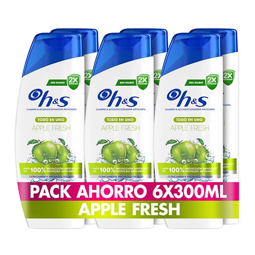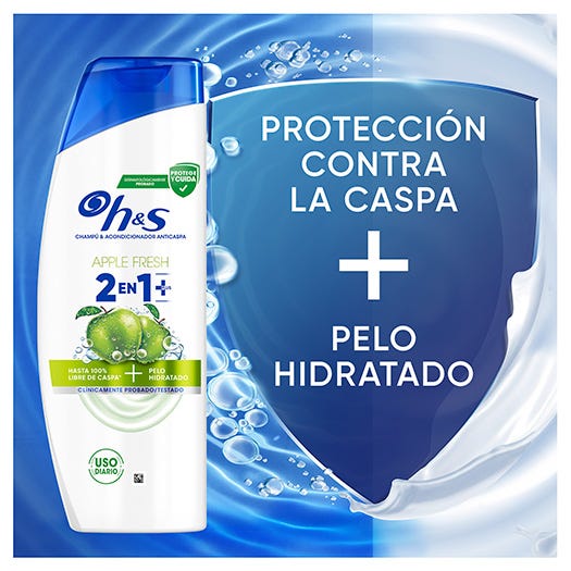 El Champú y Acondicionador Anticaspa H&S Apple Fresh Todo en Uno para todo tipo de pelo y cuero cabelludo es efectivo incluso contra la caspa más persistente. Este champú de uso diario para hombres y mujeres, con fórmula Microbiome Balance, actúa sobre la causa principal de la caspa y equilibra el microbioma del cuero cabelludo. Funciona contra la caspa visible e invisible, liberando el doble de ingredientes protectores que penetran en los poros para evitar que reaparezca la caspa severa y persistente. La fórmula del champú Todo en Uno clínicamente probada, dermatológicamente testada y con pH equilibrado contiene un 25% más de agentes acondicionantes que el champú Head & Shoulders.