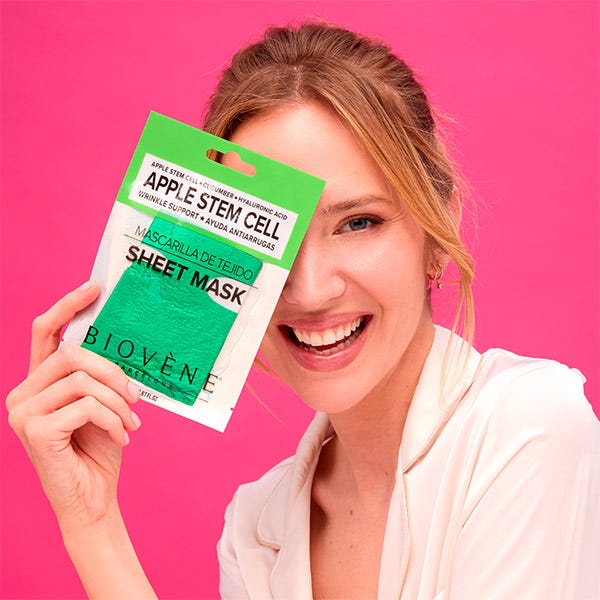 AYUDA ANTIARRUGAS Disfruta del lujo con la potente Mascarilla de Tejido Stem Cell Glamour con Células Madre de Manzana para el Apoyo contra las Arrugas. Infundida con pepino rejuvenecedor y ácido hialurónico hidratante, proporciona una experiencia similar a la de un spa. Las células madre de manzana son ricas en fitonutrientes, proteínas y células de larga vida. Descubre una apariencia hermosa y eleva tu rutina de cuidado de la piel con esta mascarilla FACIAL refrescante y revitalizadora. Fabricada de manera responsable con los ingredientes clínicos y naturales que te encantan, y libre de aquellos que podrías no desear.