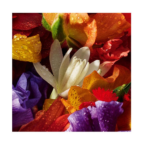 Un generoso ramillete floral multicolor ensalzado por la fuerza del sándalo y la textura aterciopelada del musgo.