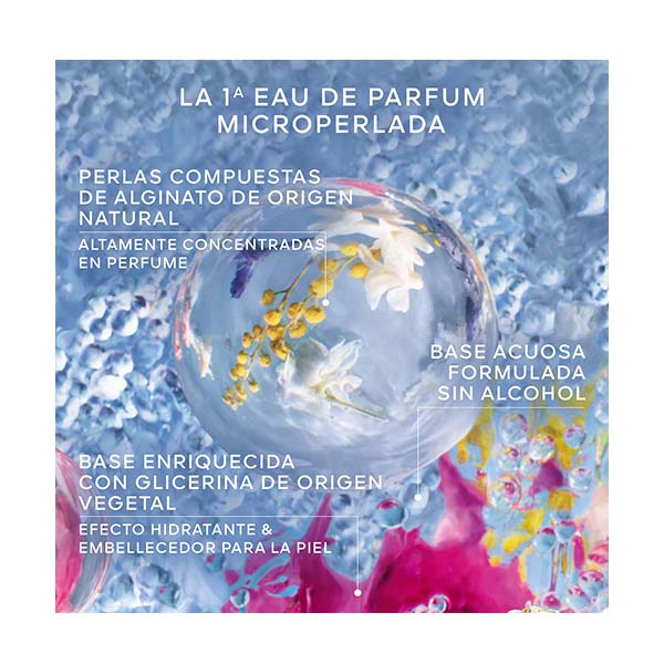 Descubre Florabloom Perle, el primer Eau de Parfum microperlado*. Concebida a medio camino entre el perfume y el tratamiento, captura la frescura de un ramillete de flores multicolores en una innovadora fórmula microperlada a base de agua. Una tecnología pionera* que combina la intensidad de las microperlas de perfume altamente concentradas con los efectos hidratantes de una base acuosa formulada sin alcohol.