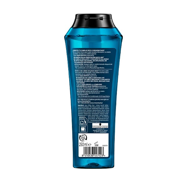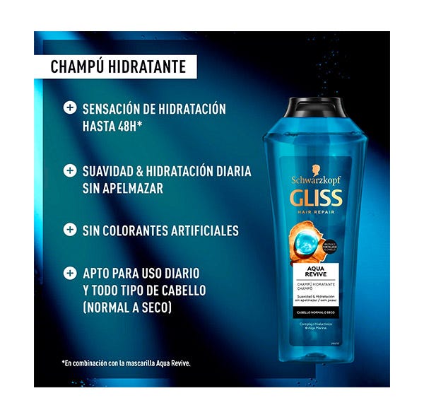 Gliss AQUA REVIVE proporciona: SENSACIÓN DE HIDRATACIÓN HASTA 48H* CABELLO BRILLANTE Y CON ASPECTO SALUDABLE APTO PARA USO DIARIO, SIN APELMAZAR, SIN COLORANTES ARTIFICIALES