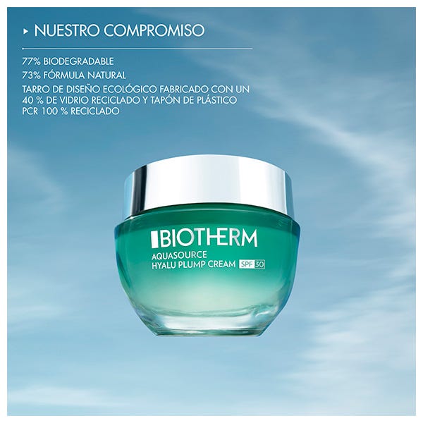 Aquasource Hyalu Plump Cream rellena y protege, dejando tu piel fresca y rejuvenecida, lista para afrontar el día. Perfecto para todo tipo de pieles, incluso las sensibles. Mejora el rendimiento de tu piel, llega más lejos y mantente protegida con Aquasource. 1 Prueba con corneómetro en 24 mujeres después de 48 horas. La crema Aquasource Hyalu Plump Cream es de origen natural en un 73 %, biodegradable en un 77 %, y se presenta en un envase ecodiseñado, que incluye un tarro fabricado con un 40 % de vidrio reciclado y un tapón de plástico 100 % reciclado PCR.