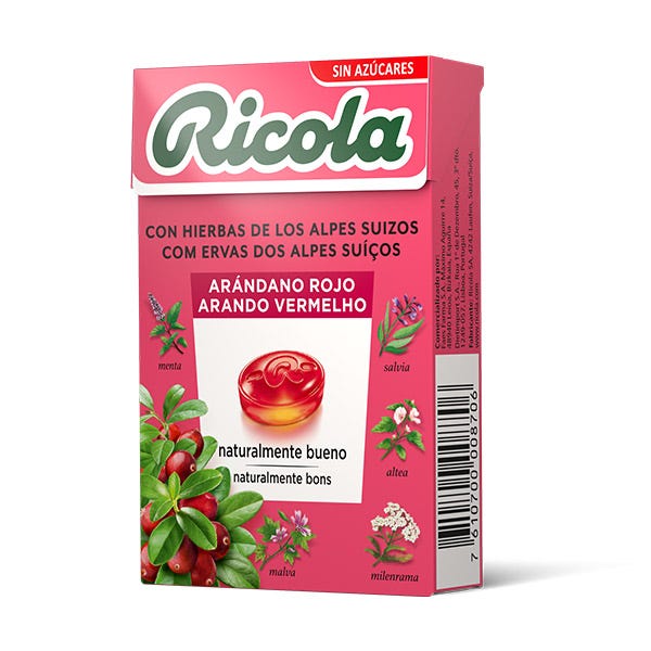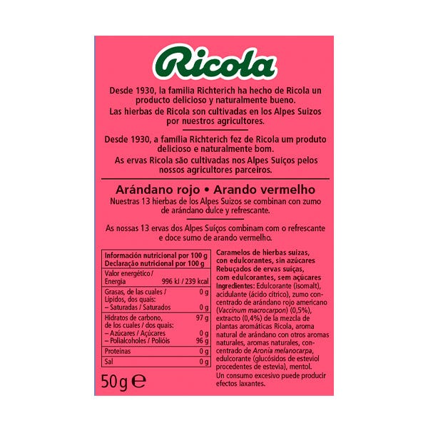 Edulcorante (isomalt), acidulante (ácido cítrico), zumo concentrado de arándano rojo americano (Vaccinum macrocarpon) (0,5%), extracto (0,4%) de la mezcla de plantas aromáticas Ricola, aroma natural de arándano con otros aromas naturales, aromas naturales, zumo concentrado de Aronia melanocarpa, edulcorante (glucósidos de esteviol procedentes de estevia), mentol.