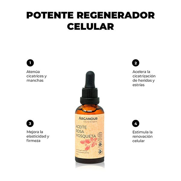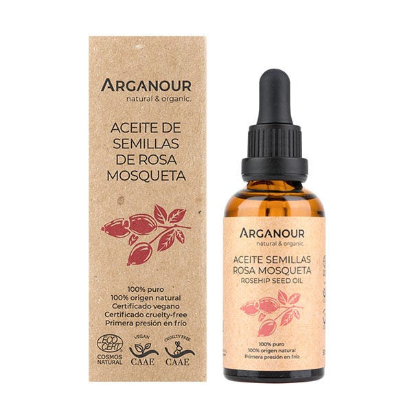 Aceite de semillas de rosa mosqueta 100% puro de Arganour, obtenido por primera presión en frío, contiene altas concentraciones en ácidos grasos esenciales.