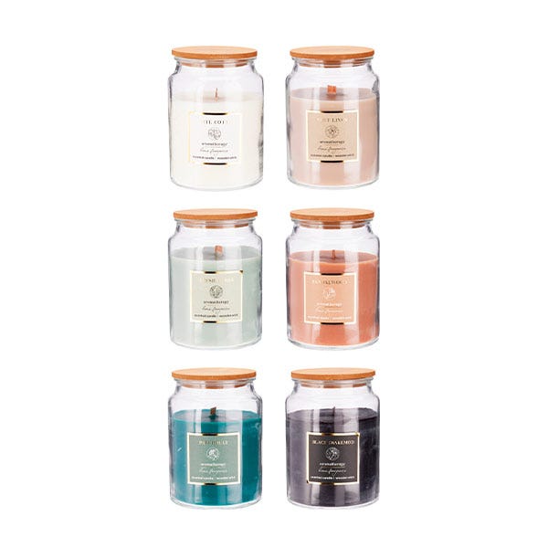 VELA PERFUMADA EN VIDRIO TRANSPARENTE CON MECHA DE MADERA, CERA DE COLORES.