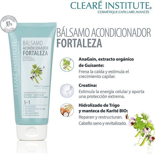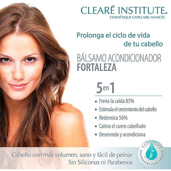 El bálsamo acondicionador fortaleza de Clearé Institute, con ingredientes naturales y ecológicos desenreda y acondiciona el cabello a la vez que estimula su crecimiento y fortaleza devolviéndole su brillo y vitalidad.