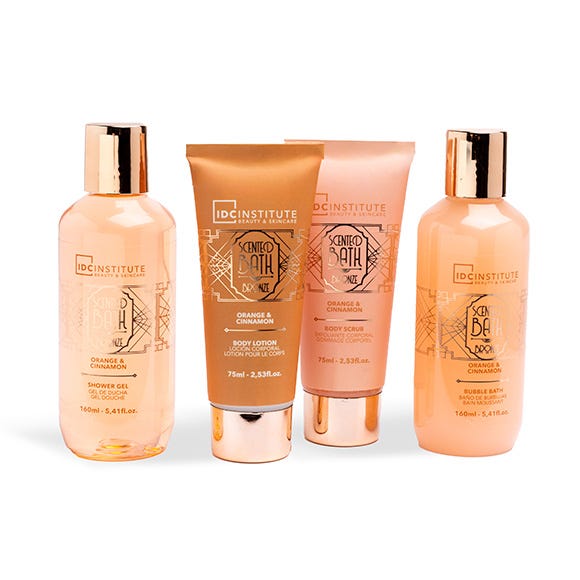 Esta bonita bandeja decorativa contiene 4 de tus productos preferidos. Encuentra un gel de ducha, un baño de burbujas, un exfoliante y una crema corporal, todos perfumados con una suave y dulce fragancia a naranja y canela.