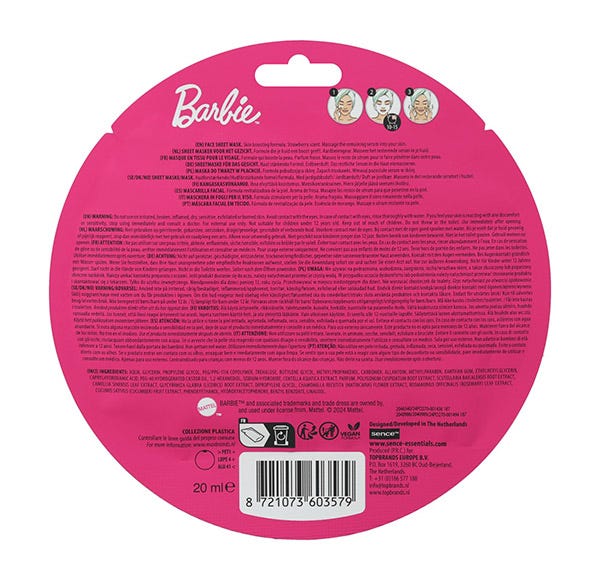 ¿Estás lista para brillar como Barbie? ¡Sumérgete en la frescura de las mascarillas faciales Barbie de Sence! Con cuatro divertidos tratamientos de mascarilla, tu rostro obtiene el máximo brillo y suavidad, transportándote a un paraíso frutal con su aroma a melón de ensueño. ¡Dile hola a la fabulosa belleza!