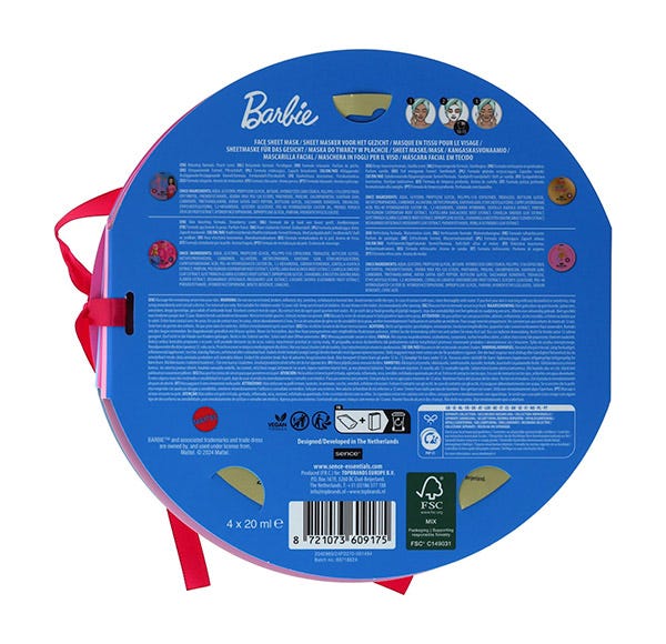 Reúne a tus amigas para divertirte con máscaras. El juego de mascarillas faciales de Barbie de Sence incluye cuatro máscaras estampadas que no solo transforman tu rostro en un aspecto resplandeciente, sino que también llenan tu noche de risas y alegría.