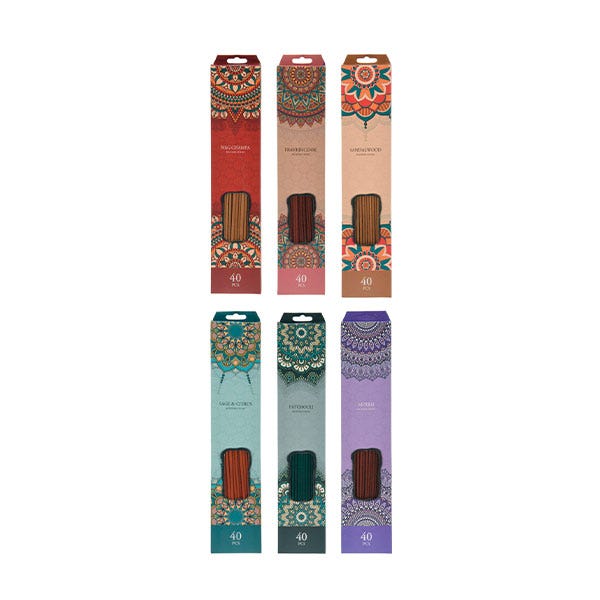 *6 AROMAS VARIADOS: INCIENSO, NAG CHAMPA, PACHULÍ, SÁNDALO, SALVIA Y CÍTRICOS, MIRRA. Te llegará según existencias.