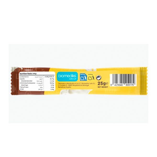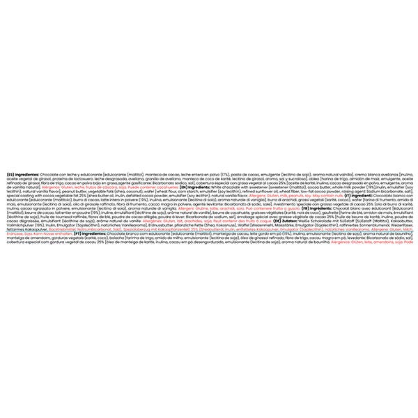 Chocolate con leche y edulcorante [edulcorante (maltitol), manteca de cacao, leche entera en polvo (17%), pasta de cacao, emulgente (lecitina de soja), aroma natural vainilla], crema blanca avellanas [inulina, aceite vegetal de girasol, proteína de lactosuero, leche desgrasada, avellana, granillo de avellana, manteca de coco de karité, lecitina de girasol, aroma, sal y sucralosa], oblea [harina de trigo, almidón de maíz, emulgente, aceite refinado de girasol, fibra de trigo, cacao en polvo bajo en grasa,agente gasificante: Bicarbonato sódico, sal], cobertura especial con grasa vegetal al cacao 25% [aceite de karité, inulina, cacao desgrasado en polvo, emulgente, aroma de vainilla natural].