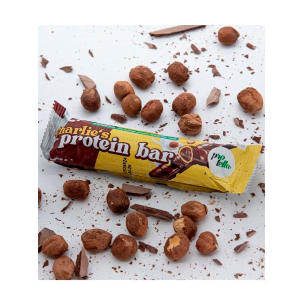 Charlie's Protein Bar, imagina la perfecta combinación de chocolate con leche y una exquisita crema de avellanas, todo envuelto en una tentadora cobertura de chocolate. ¡Una explosión de sabor en cada bocado!