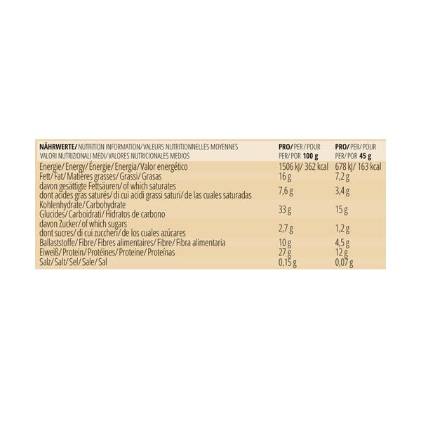 Proteínas de la leche, chocolate blanco con edulcorante (25%) (edulcorante (maltitol), manteca de cacao, leche entera en polvo, emulgente (lecitinas), aroma natural de vainilla), humectante (glicerina), agente de carga (polidextrosa), fibra de maíz soluble, agua, chocolate con edulcorante (pasta de cacao, edulcorante (maltitol), manteca de cacao, emulgente (lecitinas), aroma natural de vainilla), almendras tostadas y trituradas (4%), aceite de girasol, aroma natural, cacao desgrasado en polvo, edulcorante (sucralosa).