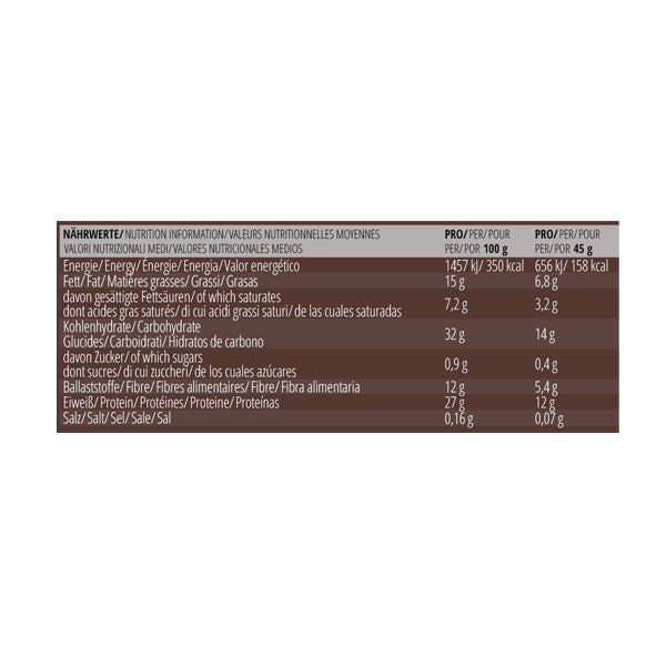 Proteínas de la leche, chocolate con edulcorante (26%) (pasta de cacao, edulcorante (maltitol), manteca de cacao, emulgente (lecitinas), aroma natural de vainilla), humectante (glicerina), agente de carga (polidextrosa), fibra de maíz soluble, agua, anacardos tostados y salados y troceados (4%), aceite de girasol, chocolate blanco con edulcorante (0,9%) (edulcorante (maltitol), manteca de cacao, leche entera en polvo, emulgente (lecitinas), aroma natural de vainilla), aroma natural, cacao desgrasado en polvo, edulcorante (sucralosa), correctores de la acidez (carbonatos de amonio, carbonatos de potasio, hidróxido de potasio).