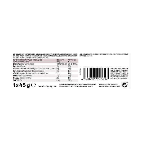 CHOCOLATE CON LECHE CON EDULCORANTE (29%) (EDULCORANTE (MATITOL), MANTECA DE CACAO, LECHE ENTERA EN POLVO, PASTA DE CACAO, EMULGENTE (LECITINAS), AROMA NATURAL DE VAINILLA), PROTEÍNAS DE LA LECHE, HUMECTANTE (GLICERINA), AGENTE DE CARGA (POLIDEXTROSA), FIBRA DE MAÍZ SOLUBLE, AGUA, TROZOS DE AVELLANAS TOSTADAS (4%), ACEITE DE GIRASOL, CONCENTRADO DE ZANAHORIA, CONCENTRADO DE ZANAHORIAS CARAMELIZADAS, AROMA NATURAL, CACAO DESGRASADO EN POLVO, AROMA, EDULCORANTE (SUCRALOSA).
