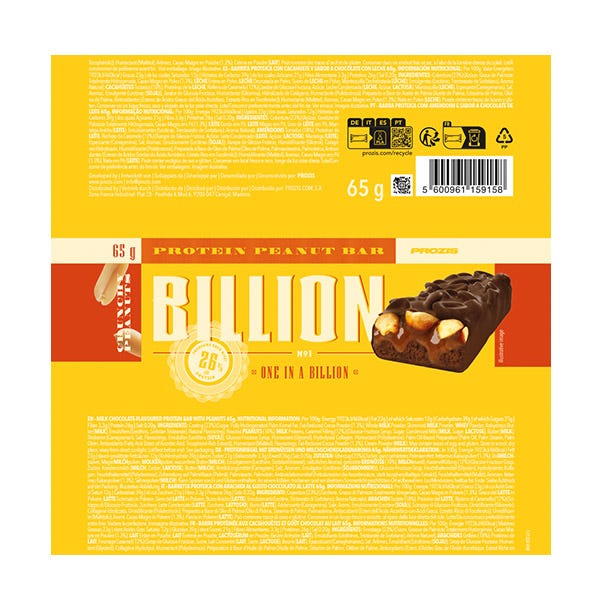 Cobertura (23%) (Azúcar, Grasa de Palmiste Totalmente Hidrogenada, Cacao Magro en Polvo (1.3%), LECHE Entera en Polvo, LECHE Desnatada en Polvo, Suero de LECHE en Polvo, Mantequilla Deshidratada (LECHE), Emulgentes (Lecitinas, Triestearato de Sorbitano), Aroma natural), CACAHUETES tostados (18%), Proteínas de la LECHE, Relleno de caramelo (12%) (Jarabe de GlucosaFructosa, Azúcar, LECHE condensada (LECHE, Azúcar, LACTOSA), Mantequilla (LECHE), Espesante (Carragenanos), Sal, Aromas, Emulgente (Lecitinas (SOJA))), Jarabe de Glucosa-Fructosa, Humectante (Glicerina), Hidrolizado de Colágeno, Humectante (Polidextrosa), Preparado a Base de Aceite de Palma (Aceite de Palma, Estearina de Palma, Oleína de Palma, Antioxidantes (Ésteres de Ácidos Grasos del Ácido Ascórbico, Extracto Rico en Tocoferoles)), Humectante (Maltitol), Aromas, Cacao Magro en Polvo (1.3%), Nata en polvo (LECHE). Puede contener trazas de huevo y gluten.