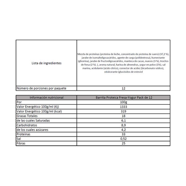Mezcla de proteínas (proteína de leche, concentrado de proteína de suero) (37,2 %), jarabe de isomaltoligosacáridos, agente de carga (polidextrosa), humectante (glicerina), jarabe de fructooligosacáridos, manteca de cacao, nueces (3 %), trocitos de fresa (2 %). ), aroma natural, harina de almendras, yogur en polvo (1%), sal marina, acidulante (ácido cítrico), corrector de acidez (bicarbonato sódico), edulcorante (glucósidos de esteviol).