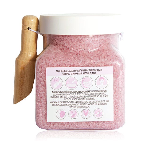 Revitaliza tu piel y alivia los músculos cansados ​​con unas cucharadas generosas de sales marinas naturales infundidas con extracto de bayas de acai.