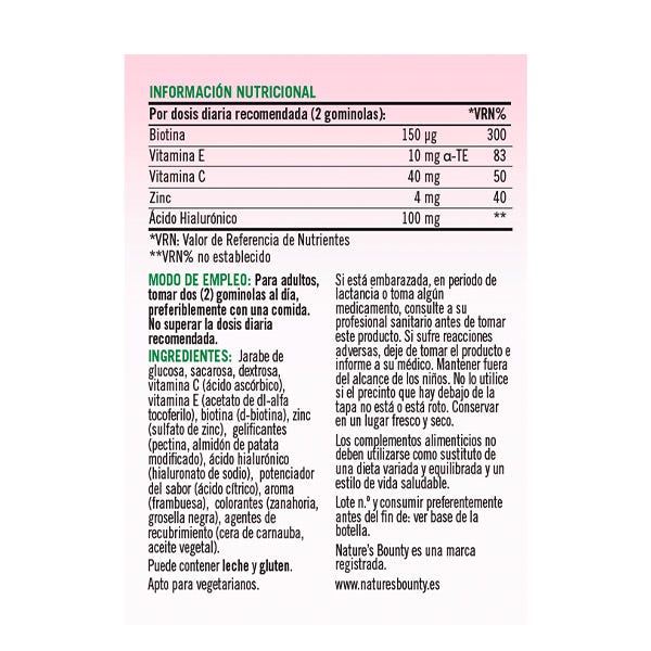 Cada dos gominolas aportan: Ácido hialurónico 100 mg, Vitamina C 40 mg, vitamina E 10 mg, zinc 4 mg, biotina 150 mcg