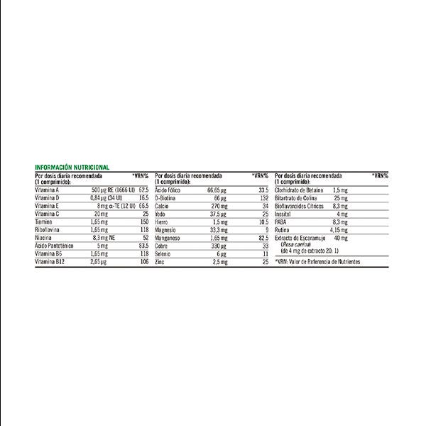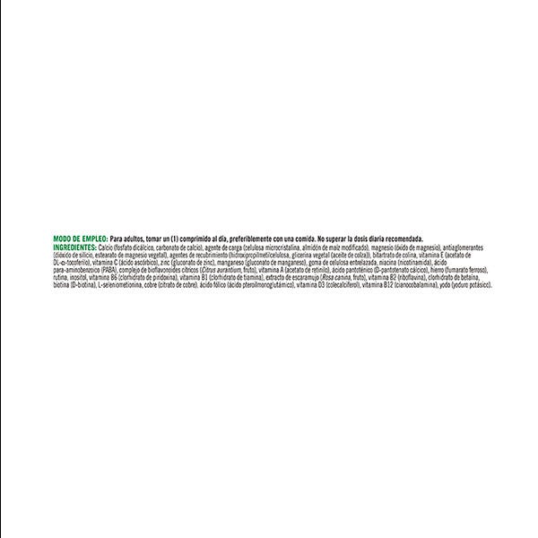 Calcio (fosfato dicálcico, carbonato de calcio), agente de carga (celulosa microcristalina, almidón de maíz modificado), magnesio (óxido de magnesio), antiaglomerantes (dióxido de silicio, estearato de magnesio vegetal), agentes de recubrimiento (hidroxipropilmetilcelulosa, glicerina vegetal (aceite de colza)), bitartrato de colina, vitamina E (acetato de DL-alfa-tocoferilo), vitamina C (ácido ascórbico), zinc (gluconato de zinc), manganeso (gluconato de manganeso), goma de celulosa entrelazada, niacina (nicotinamida), ácido para-aminobenzoico (PABA), complejo de bioflavonoides cítricos (Citrus aurantium, fruto), vitamina A (acetato de retinilo), ácido pantoténico (D-pantotenato cálcico), hierro (fumarato ferroso), rutina, inositol, vitamina B6 (clorhidrato de piridoxina), vitamina B1 (clohidrato de tiamina), extracto de escaramujo (Rosa canina, fruto), vitamina B2 (riboflavina), clorhidrato de betaína, biotina (D-biotina), L-seleniometionina, cobre (citrato de cobre), ácido fólico (ácido pteroilmonoglutámico), vitamina D3 (colecalciferol), vitamina B12 (cianocobalamina), yodo (yoduro potásico).
