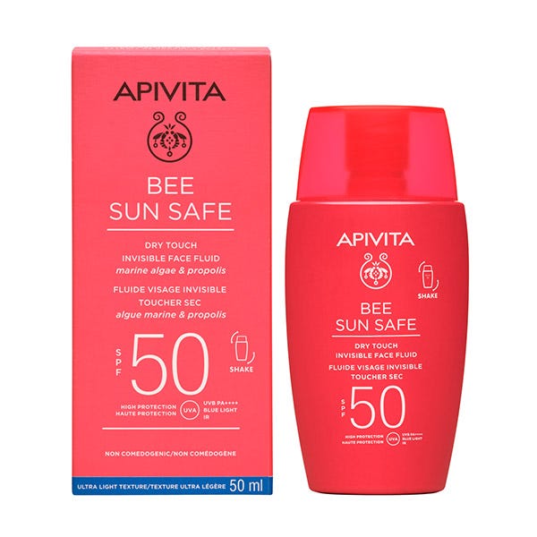 Protector solar fluido y ligero para el rostro con acabado empolvado.
