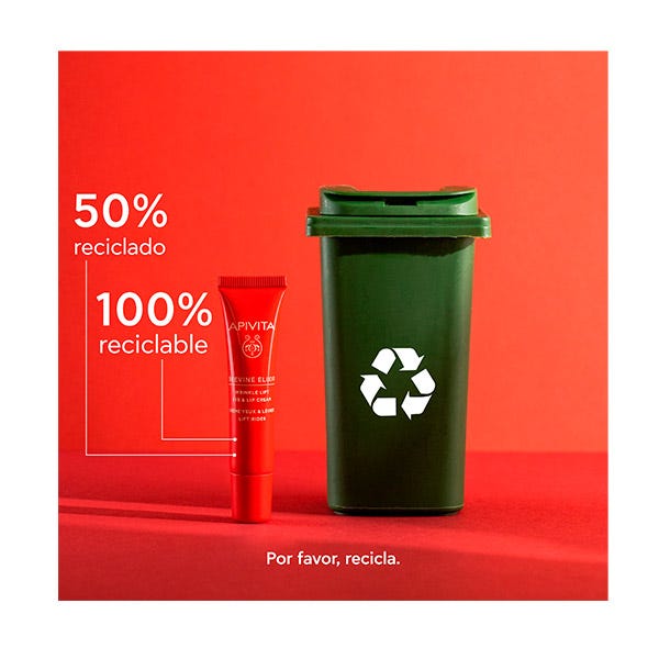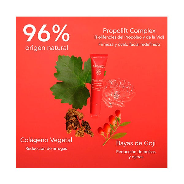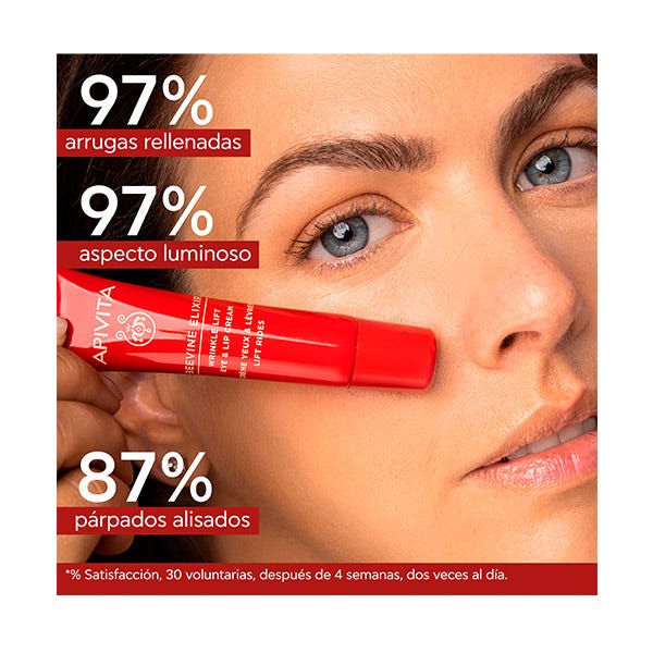 Rellena las arrugas, proporciona un aspecto de piel más firme y alisa los parpados gracias a los polifenoles del propóleo y de la vid y el colágeno vegetal