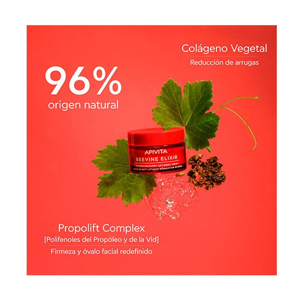 Rellena las arrugas, proporciona un aspecto de piel más firme y redefine el óvalo facial gracias a los polifenoles del propóleo y de la vid y el colágeno vegetal