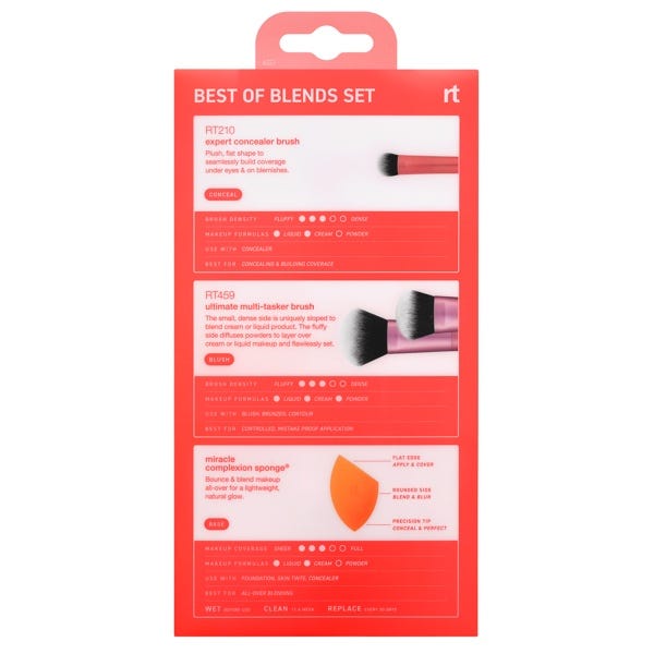 Usa la Expert Concealer Brush para construir cobertura líquida o en crema debajo de los ojos o sobre imperfecciones. La Ultimate Multi-Tasker Brush de doble punta difumina productos en crema o líquidos por un lado y polvos por el otro. Finaliza con la Miracle Complexion Sponge para aplicar a toquecitos y difuminar fórmulas líquidas o en crema, logrando un acabado natural y sin marcas. Cada herramienta del set ofrece alto rendimiento y facilidad de uso.