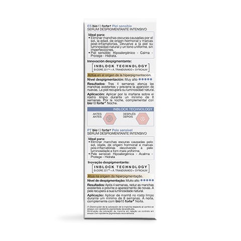 Reduce visiblemente todo tipo de manchas oscuras: manchas causadas por el sol, la edad, manchas hormonales y post-inflamatorias. Con la tecnología exclusiva INBLOCK TECHNOLOGY: una combinación de B-CORE 221TM y Ácido Tranexámico para tratar las manchas de manera integral, actuando en todas las fases del proceso de formación de las manchas. En tan solo 4 semanas, las manchas se atenúan notablemente para una piel luminosa, uniforme y sin manchas.