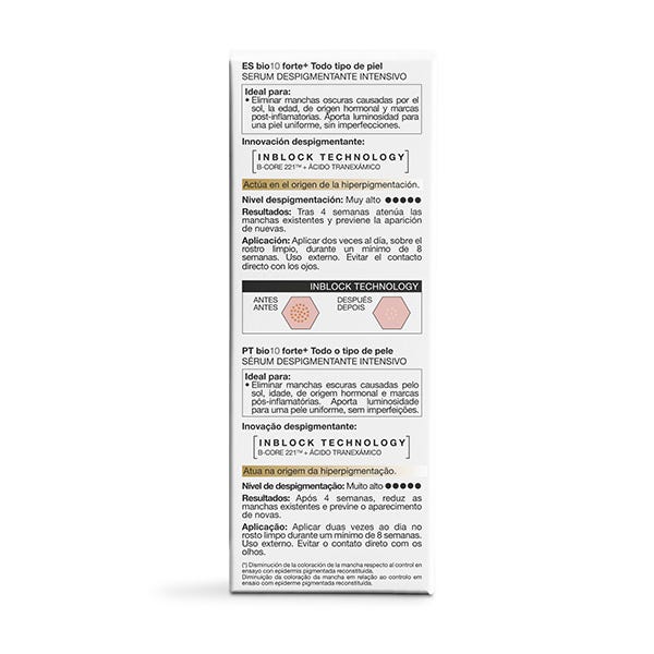 Reduce visiblemente todo tipo de manchas oscuras: manchas causadas por el sol, la edad, manchas hormonales y post-inflamatorias. Con la tecnología exclusiva INBLOCK TECHNOLOGY: una combinación de B-CORE 221TM y Ácido Tranexámico para tratar las manchas de manera integral, actuando en todas las fases del proceso de formación de las manchas. Apto para todo tipo de piel. En tan solo 4 semanas, las manchas se atenúan notablemente para una piel luminosa, uniforme y sin manchas.