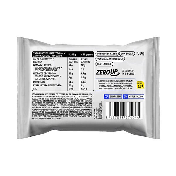 COBERTURA DE CHOCOLATE NEGRO CON EDULCORANTES (51%) (CACAO: 60% MÍN) [PASTA DE CACAO, EDULCORANTES (ERITRITOL, GLUCÓSIDOS DE ESTEVIOL PROCEDENTES DE ESTEVIA, GLUCÓSIDOS DE ESTEVIOL GLUCOSILADOS), MANTECA DE CACAO, INULINA, CACAO DESGRASADO EN POLVO, EMULGENTE (LECITINA DE GIRASOL), AROMA NATURAL DE VAINILLA], ALMENDRAS TOSTADAS (39%), PREPARADO DE FIBRAS ALIMENTARIAS (FIBRA VEGETAL, FIBRA DE ACHICORIA, PASTA DE ALMENDRAS, EDULCORANTES (GLUCÓSIDOS DE ESTEVIOL PROCEDENTES DE ESTEVIA, GLUCÓSIDOS DE ESTEVIOL GLUCOSILADOS), SAL (0,8%). UN CONSUMO EXCESIVO PUEDE PRODUCIR EFECTOS LAXANTES. PUEDE CONTENER TRAZAS DE OTROS FRUTOS SECOS, CACAHUETES Y LECHE.
