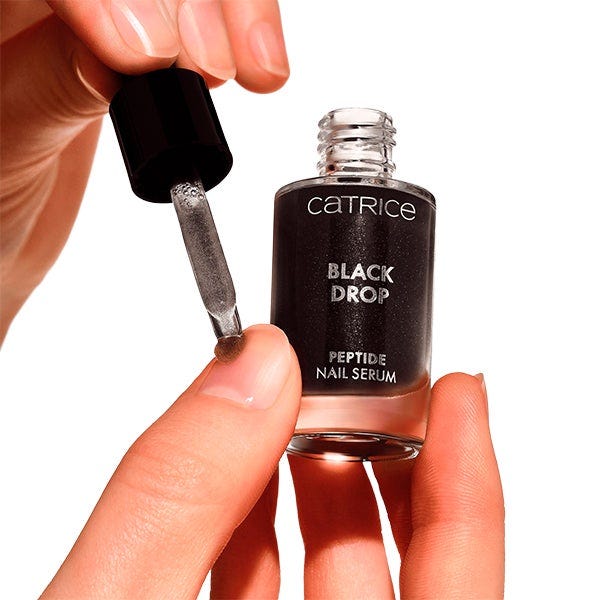 El sérum de uñas Catrice Black Drop Peptide Nail Serum convierte tu rutina de uñas en un ritual impactante y la base negra translúcida con delicado brillo plateado hace que la aplicación sea una verdadera declaración de belleza. Más allá de su cautivador aspecto, este sérum en gel mima las uñas y cutículas con péptidos de arándano, glicerina y pantenol. La ligera fragancia de orquídea añade un toque de elegancia a cada uso.