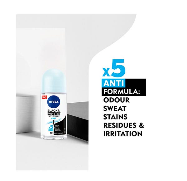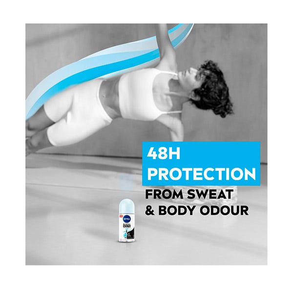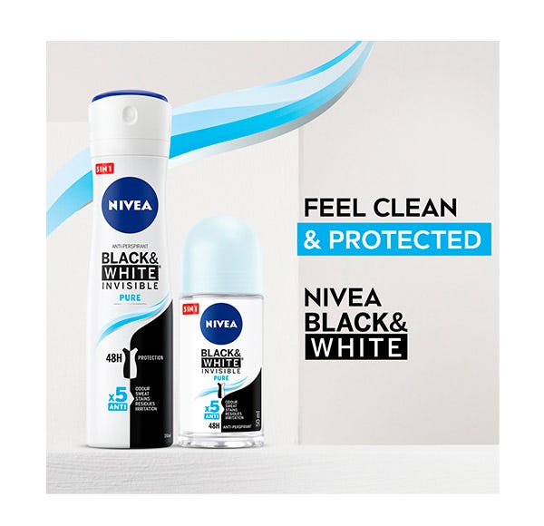 NIVEA Black & White Invisible Active Roll-on: despídete de las manchas de desodorante en tu ropa. Su fórmula ha sido desarrollada con la ayuda de expertos en productos textiles (“Hohenstein International Textile Institute”) con el fin de ofrecer una potente protección anti-transpirante que evita la aparición de manchas blancas en la ropa negra y reduce la aparición de marcas amarillas en tu ropa blanca. Garantiza 48 horas de protección anti-transpirante, con protección antibacterias y con una sutil y femenina fragancia. Su formato roll-on muy eficaz, proporciona máxima suavidad sobre la piel con un aroma duradero: Black & White Invisible Active Roll-on.