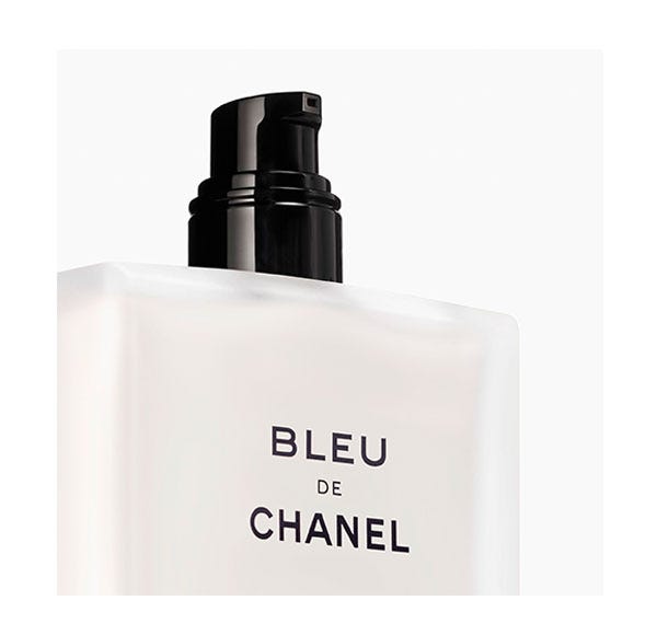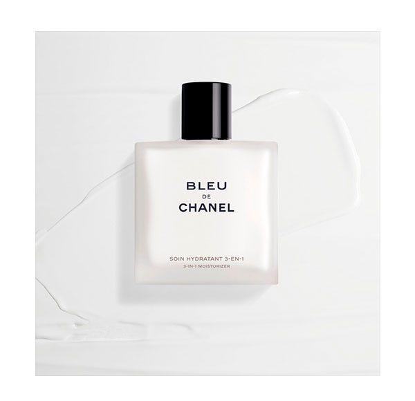 El Tratamiento Hidratante 3 en 1BLEU DE CHANELcalma la piel después del afeitado, la hidrata y ayuda a disciplinar la barba.