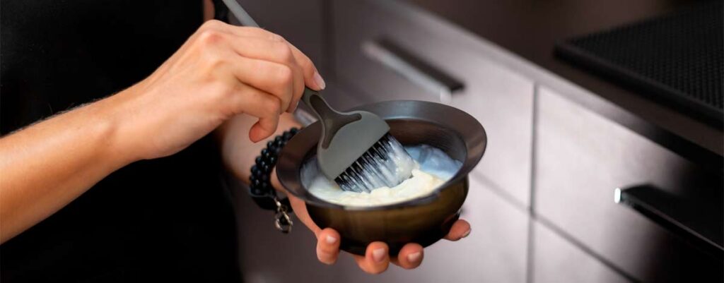 Empieza por los largos y puntas, dejando la raíz para el final, ya que el calor del cuero cabelludo acelera el proceso. Usa una brocha para aplicar la mezcla de forma uniforme, evitando tocar la piel.