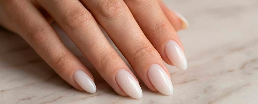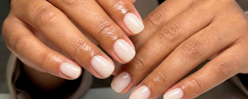 El resultado ideal de las milky nails debe ser un velo blanco uniforme, brillante y pulido, que deje entrever ligeramente la uña natural, con un brillo espejo y regularidad del tono.