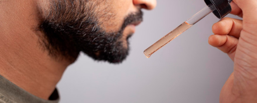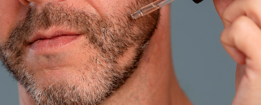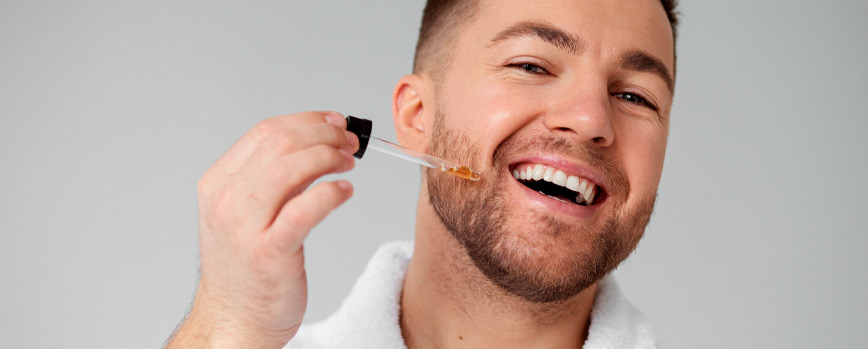 - Coloca unas gotas (generalmente entre 2 y 5, según la longitud de la barba) en la palma de la mano.