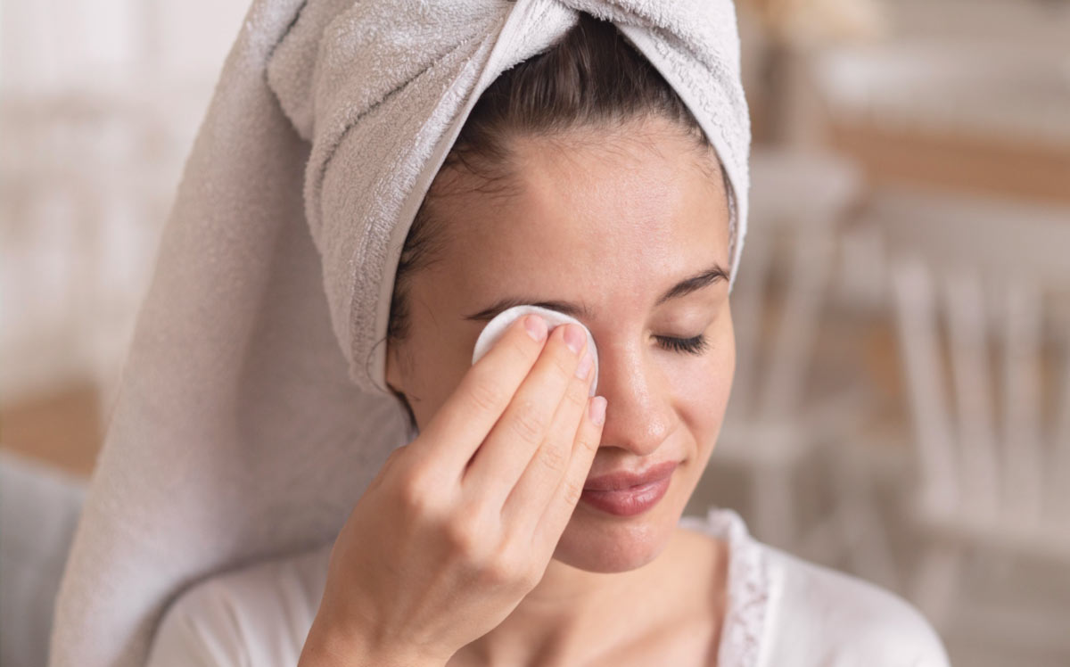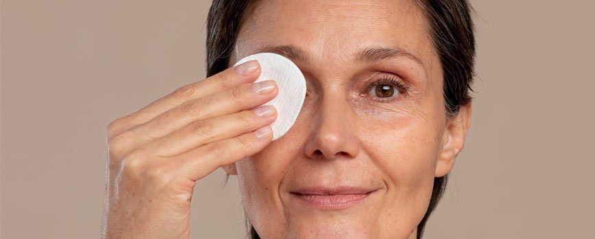 Empapar un algodón, colocarlo sobre el párpado cerrado, esperar unos segundos y deslizar suavemente hacia abajo sin frotar la piel.