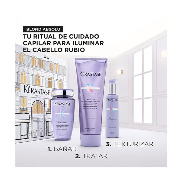 Paso 2: Cicaflash: Aplicar una cantidad de Cicaflash del tamaño de una avellana sobre el cabello recién lavado y secado con toalla. Masajear de medios a puntas y evitar la raíz para conseguir un volumen ligero. Dejar actuar de 2 a 3 minutos. Emulsionar y aclarar con agua abundante.
