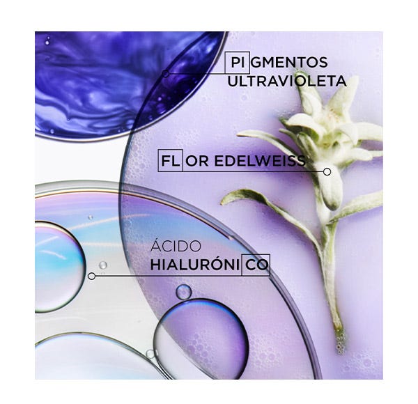 • Flor de Edelweiss: Rico en antioxidantes para proteger de la contaminación diraria. Suaviza y calma la fibra.