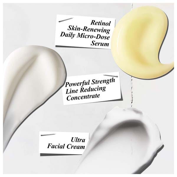 Combina la eficacia de nuestras fórmulas para reducir las líneas de expresión, las arrugas y reafirmar el rostro, y utiliza nuestra crema facial n.º 1 en ventas, Ultra Facial Cream, para una piel hidratada. Reduce las líneas de expresión con Powerful-Strength Line-Reducing Concentrate: Ayuda a reafirmar la piel con el tiempo, al mismo tiempo que reduce visiblemente las líneas de expresión, las arrugas y aumenta la luminosidad. Reduce las arrugas con Retinol Skin-Renewing Daily Micro-Dose Serum: Formulado para quienes usan Retinol por primera vez. Reduce visiblemente las arrugas, reafirma la piel, unifica el tono y la textura con una mínima incomodidad. Hidrata la piel con Ultra Facial Cream: Hidratante ligera y no grasa que aumenta la hidratación de la piel y la deja más suave y visiblemente más saludable.