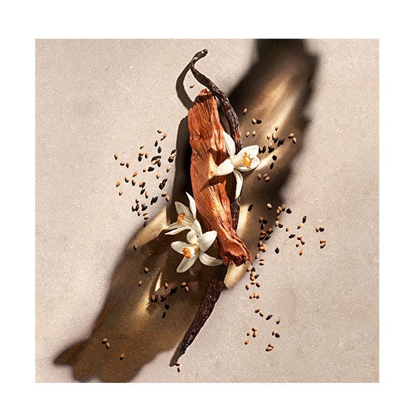 • En el fondo, notas sensuales de vainilla tostada se mezclan con un acorde de sándalo cremoso para una estela de fragancia irresistible.